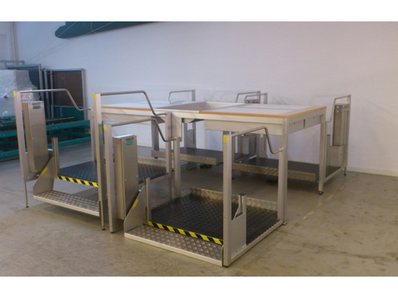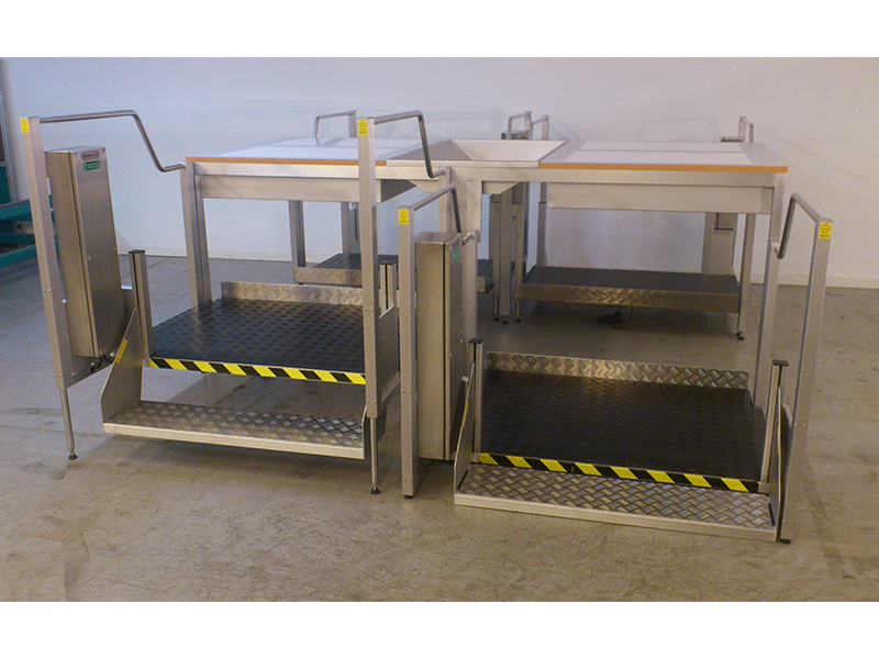 Arbetsbord med fyra arbetsstationer och tillhörande ergonomiska lyftgolv i rostfritt utförande. Stationerna är utrustade med underbelysning för att underlätta kontroll av produkter.