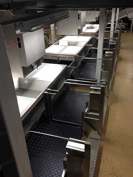 Bloms har levererat kundanpassade arbetsstationer bestående av rostfria, kundanpassade arbetsbord med tillhörande ergonomiska arbetsgolv. Både bordet och golven har stativ av betat rostfritt stål, och borden är utrustade med underbelysning som lyser upp vita plastskivor vid stationerna där produkterna kontrolleras.
