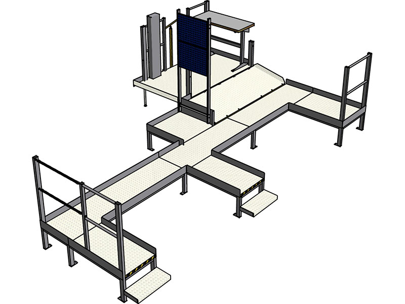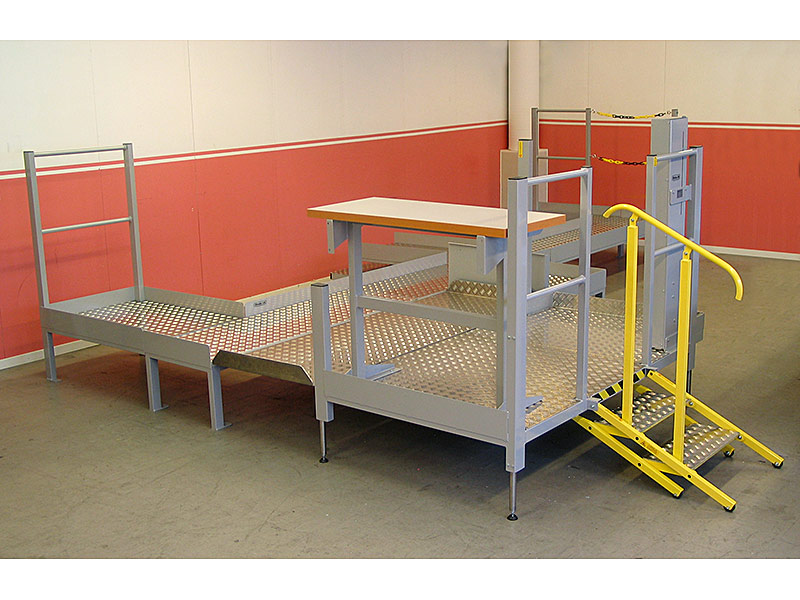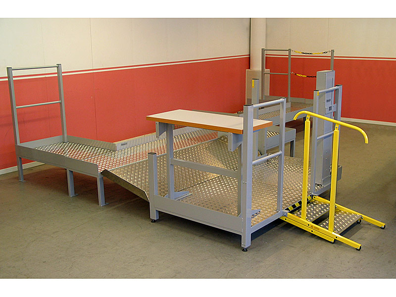 Denna arbetsplattform består av både ett fast golv, samt ett höj- och sänkbart lyftgolv, med en anpassad gångramp som är monterad på rörliga golvet. Denna anpassar sig efter höjdläget emot det fasta golvet.