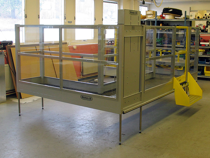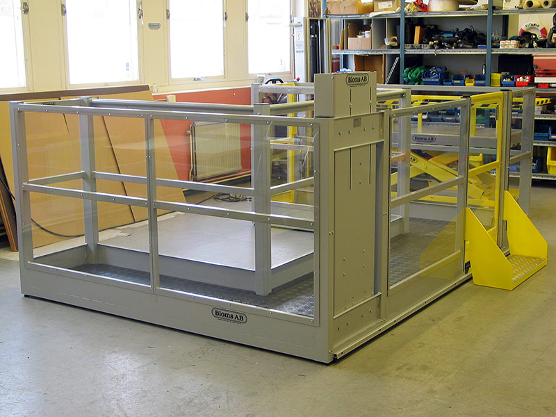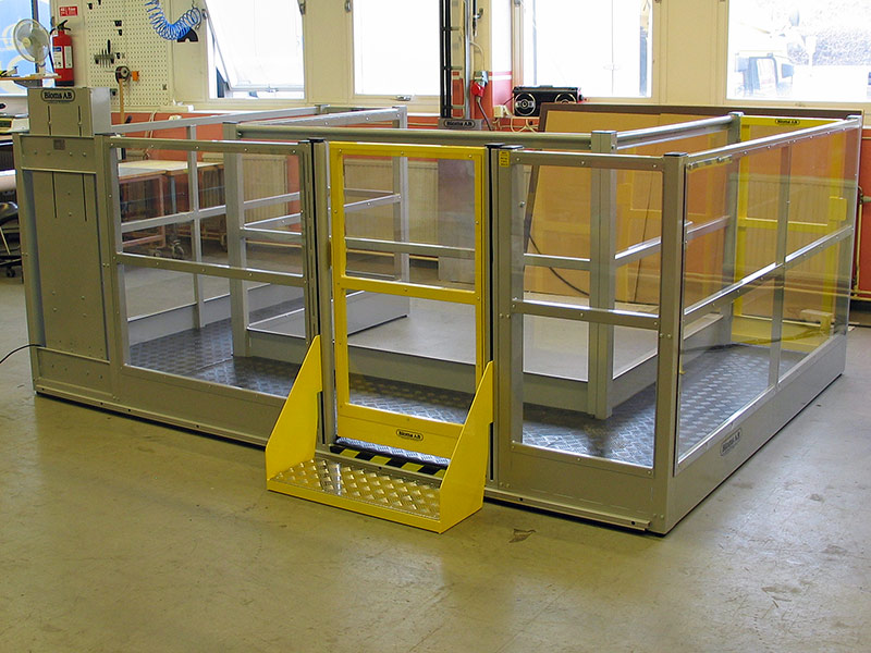 Lyftgolv anpassat efter kunden arbetsplats, försett med höga räcken med sparkskydd, samt självstängande grindar och trappa.