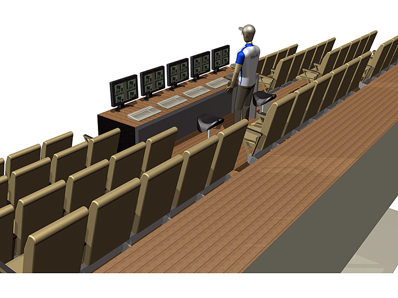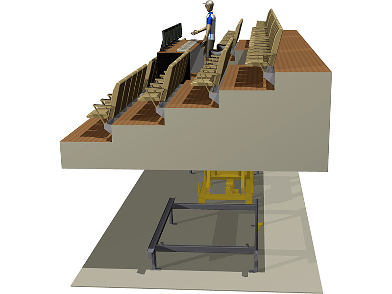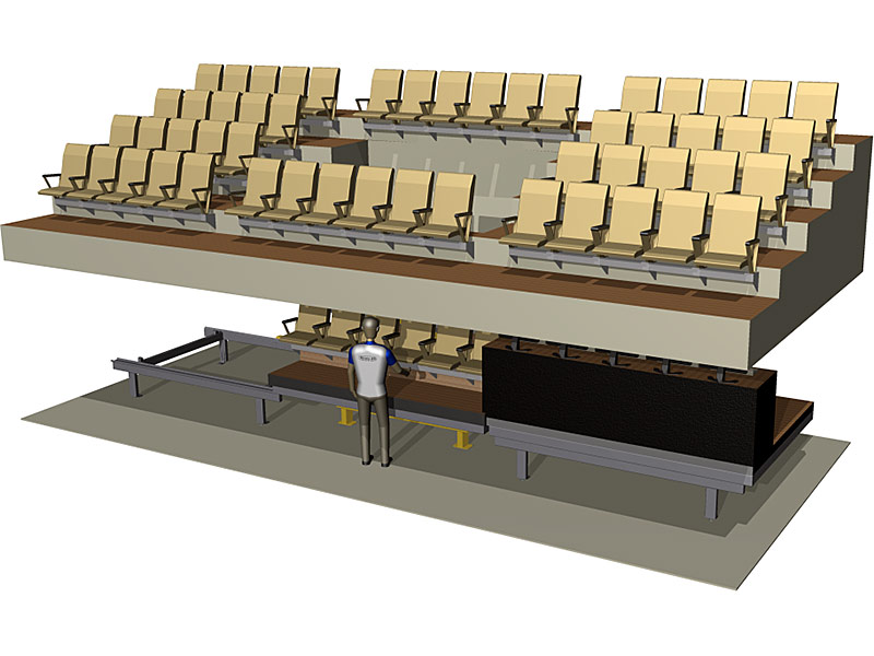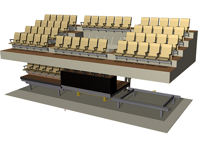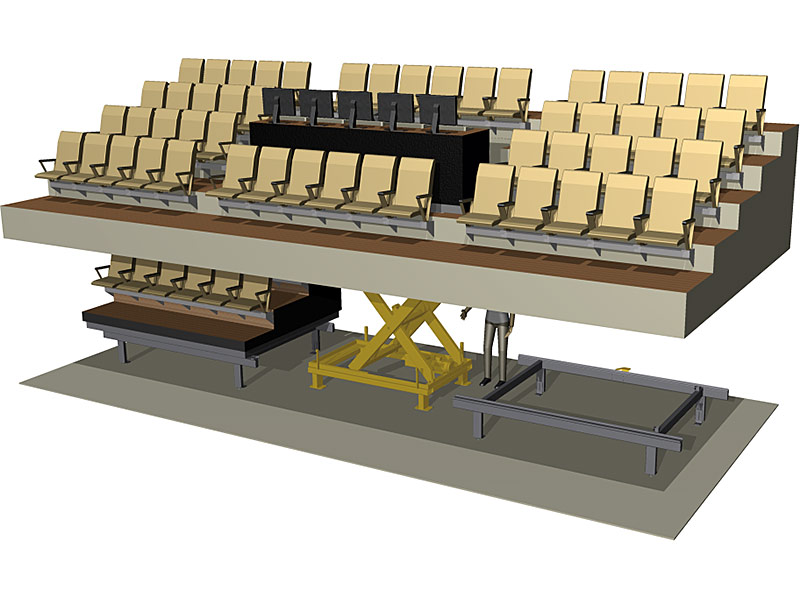 En Stadsteater behövde hjälp med att de ville ha en regissörspanel ute bland stolsraderna, utan att behöva offra några läktarstolar. Bloms löste problemet genom att sätta en läktarsektion på ett stort saxlyftbord som kunde hissas ner under läktaren och bytas ut mot datorpanel.