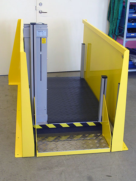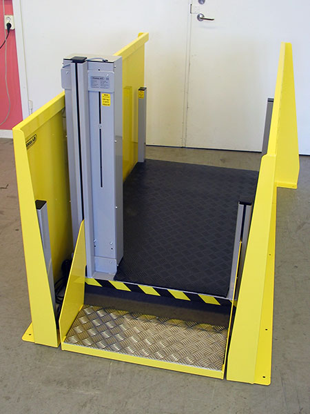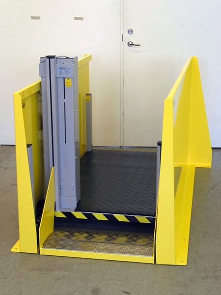 Kundanpassat lyftgolv med skydd för klämrisker. Elektriskt höj- och sänkbar plattform med skyddsplåtar. Utrustad med ergonomisk arbetsplatsmatta och medföljande trappa.