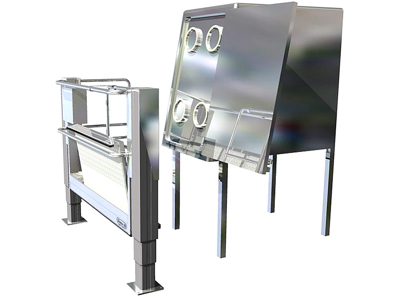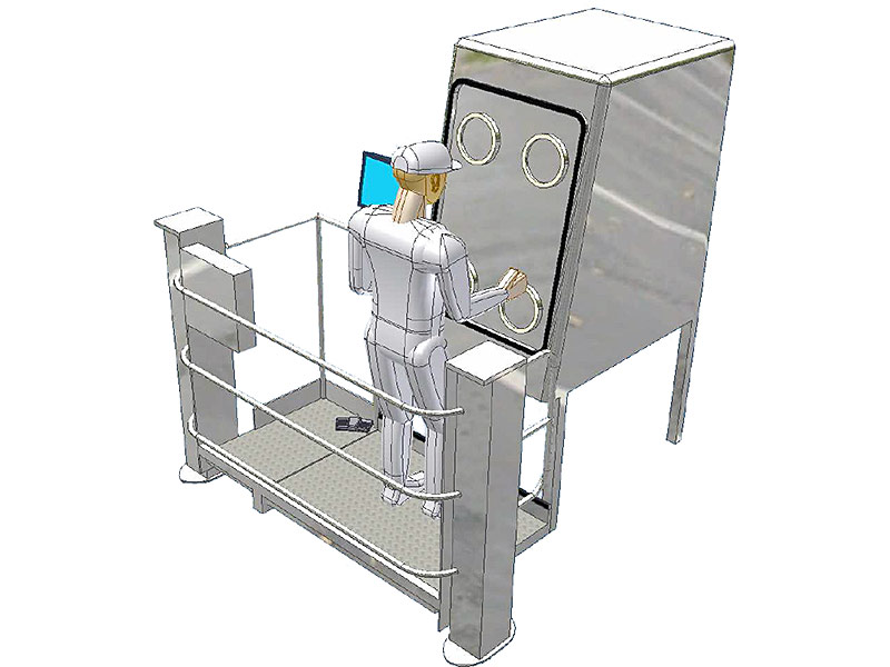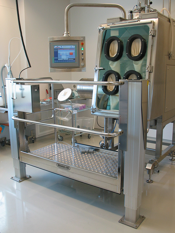 Här har Bloms levererat ett rostfritt lyftgolv till ett läkemedelsföretag där de behövde hjälp med att kunna jobba framför ett skåp med arbetshål på två nivåer. Denna arbetsplattform hjälper personalen att jobba på båda nivåerna, och anpassar arbetsplatsen oavsett längd. Höjdjusteringen sker enkelt med fotpedal. En del av golvet är uppfällbart för att ge personalen lättare åtkomst när golvet inte används.
