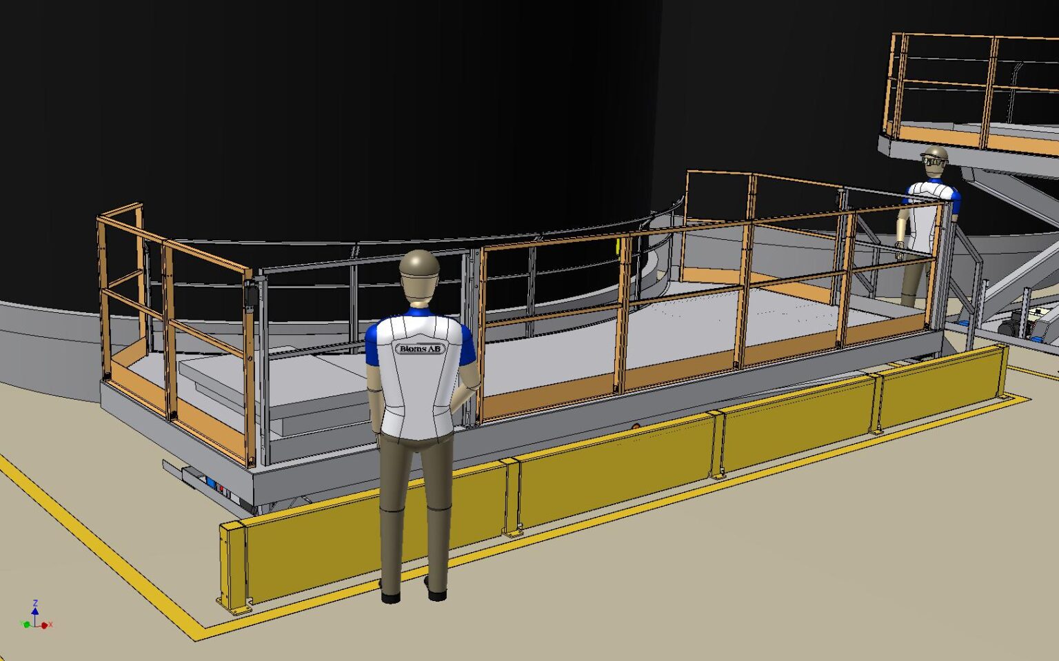 Arbetsplattformen har en trappa för att man skall kunna ta sig upp på ett enkelt sätt. Denna monteras direkt på industrigolvet.