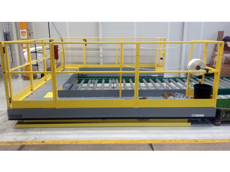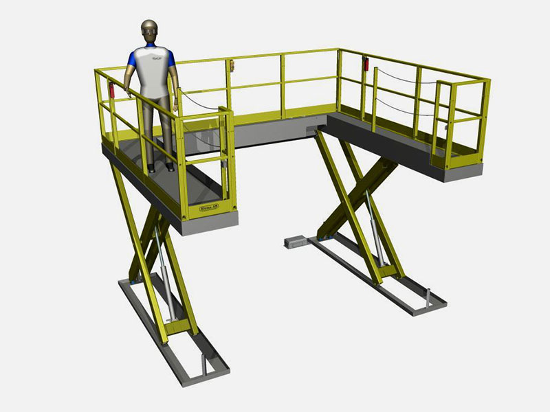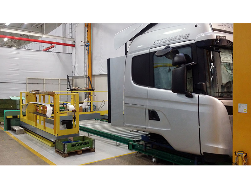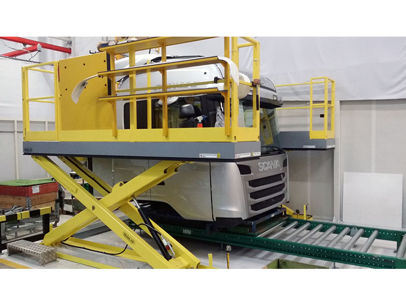 Arbetsplattform anpassad för kunds produktion av lastbilshytter. Vid stationen monteras två olika storlekar av hytter och arbetsgolvet är utrustat för att både kunna garantera säkerheten för personal samt ge en ergonomiskt riktig arbetsställning. Plattformen är utrustad med ett flyttbart räcke på insidan, fotoceller, räcken med sparkplåt, fast trappsteg på golvet, samt inåtgående självstängande grindar.