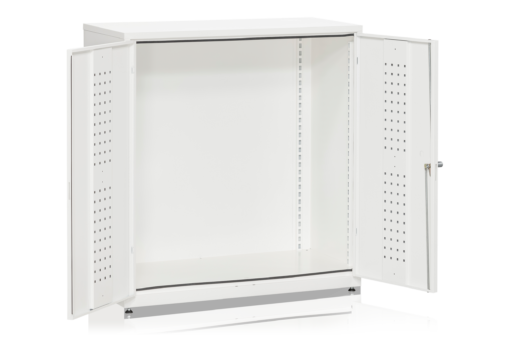 Helsvetsat skåp i mycket robust konstruktion, för inomhusbruk. Skåpet har låsbart handtag. Ett utbryt i skåpets tak gör det möjligt att montera ett ventilationsstos, 100 mm. Ventilationsstos ingår. Skåpet är tätat med gummilist runt och mellan dörrparen. Pulverlackerat i vit RAL 9010. Skåpet är ej avsett för brandfarliga varor. Hyllplan och uppsamlingstråg finns som tillbehör.